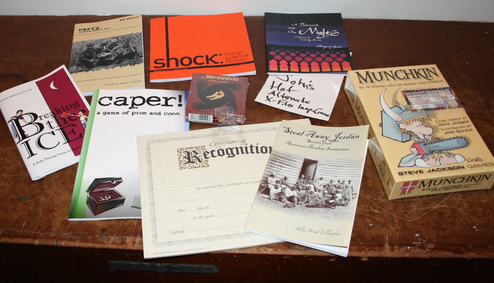 In past JiffyCons we've featured locally grown games like Time and Temp, Shooting the Moon, Misspent Youth, 1001 Nights, and Shock:, games in development that such as Tales of the Fisherman's Wife, and board games like Mechaton. We love both the old school and the new fangled. We offer games for kids as young as 8, games for a general audience, and games strictly for adults. Our attendees have come from far and wide throughout New England and the Middle States, and our attendance has steadily increased over the past three years. We couldn't have done it without the kind folks who GM, DM, and facilitate GM-less goodness.